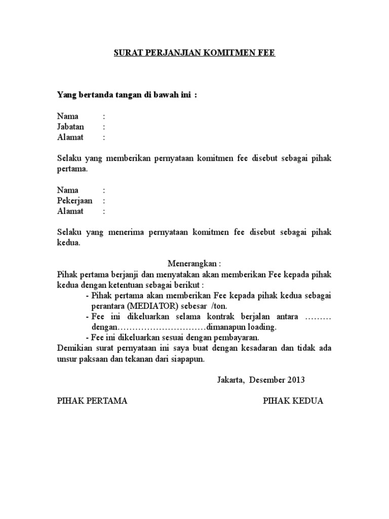Surat Perjanjian Komitmen Fee from imgv2-2-f.scribdassets.com Pihak pertama adalah pemilih rumah yang akan dikontrakan, sedangkan pihak kedua adalah orang yang hendak menyewa rumah tersebut. Di bawah ini ada contoh surat perjanjian jual beli rumah yang mengandung 11 pasal di dalamnya yang mengikat pihak pertama (penjual) dan pihak kedua (pembeli). Semoga dapat memudahkan proses dalam mengakuisisi rumah impian. Yang bertanda tangan di bawah ini Savesave surat perjanjian komitmen fee for later. Kali ini akan saya bahas mengenai contoh surat perjanjian jual beli. Surat perjanjian jual beli tanah. Direktur pt abc alamat :